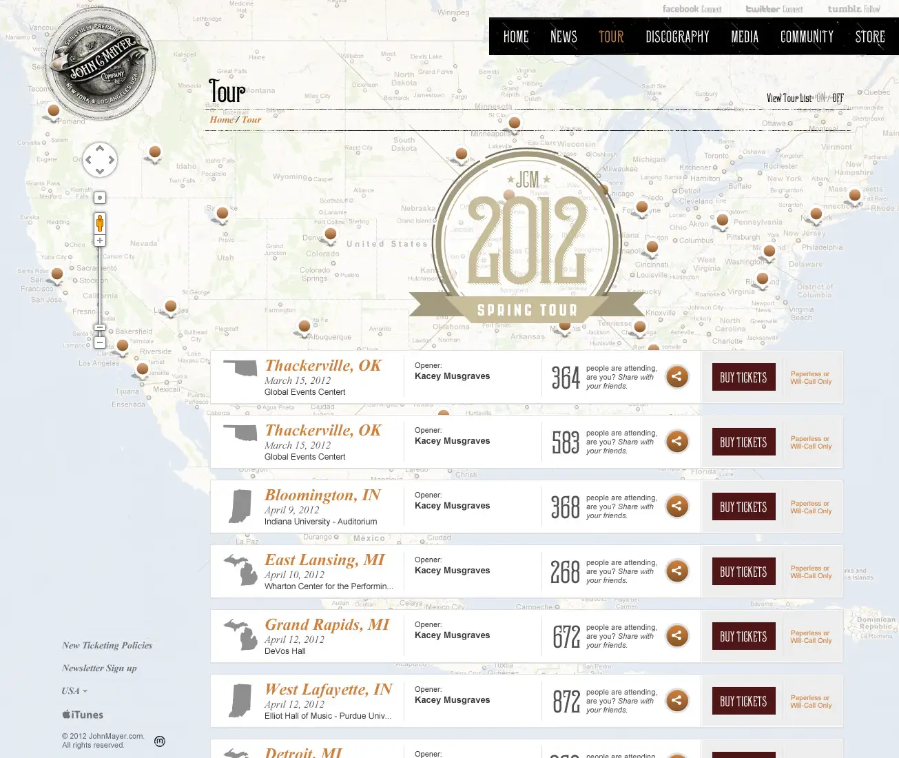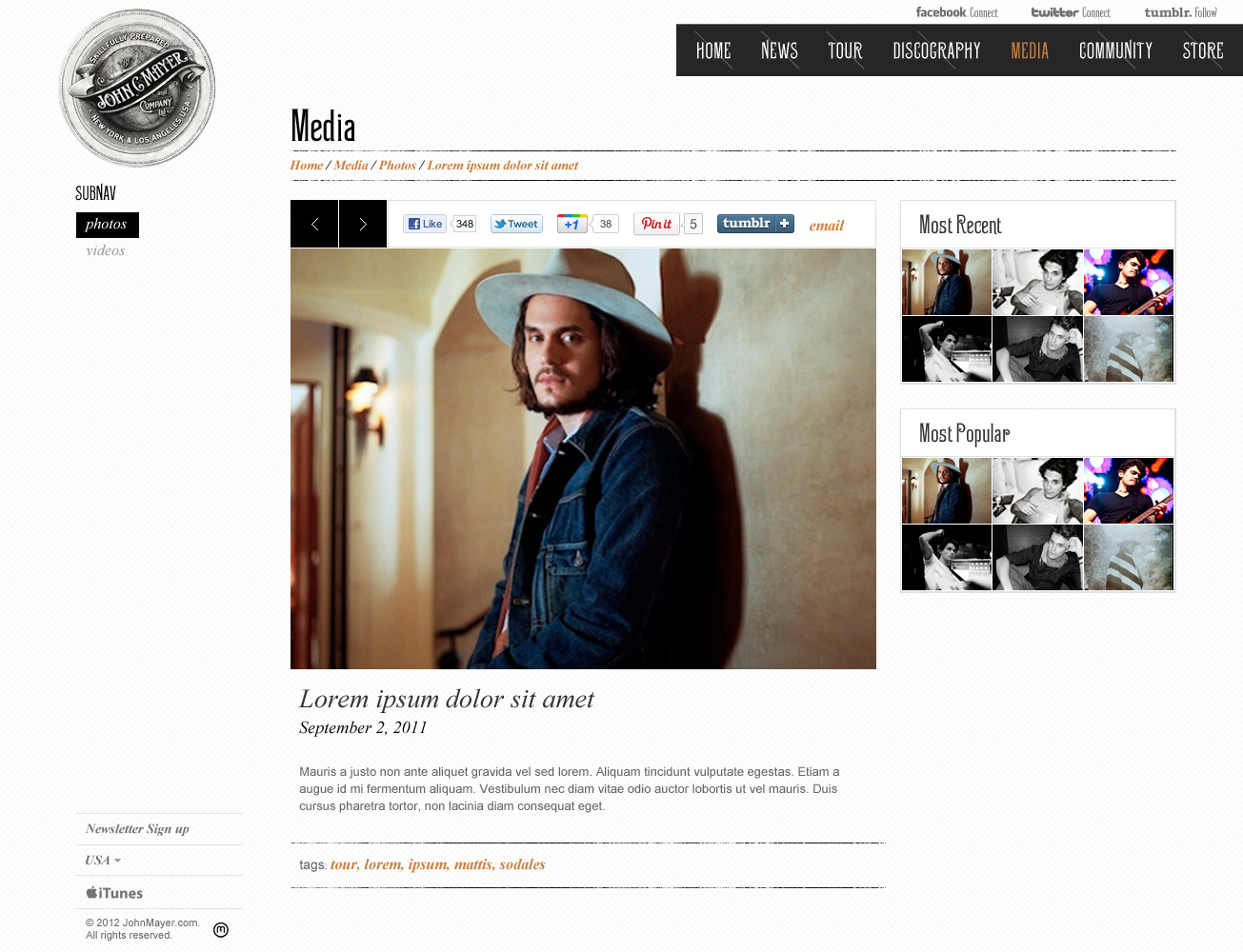 The site was designed and developed in a matter of weeks for the release of John's tour dates. Unfortunately, all those dates had to be cancelled. The design was created before any of the Born & Raised album branding was done, so we wanted to keep the layout clean.
