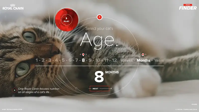 I was tasked with designing a pitch for a questionnaire to help user find the right type of Royal Canin cat food. The user would answer 5 questions, view additional info along the way and then be given a few recommendations for the right type of cat food.